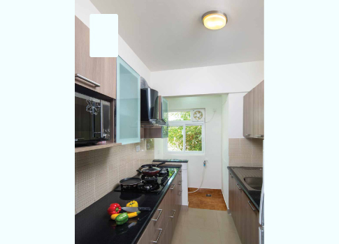 Vitrified tiles flooring, black granite kitchen platform counter with a chamfered finish and cladding with glazed tiles up to 2 feet height. Stainless steel sink with drain board. Provision for exhaust fan, one light point, two 6 amp points and two 16 amp points.